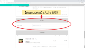 注文の際、購入者情報を入力し、お支払方法を入力した後のクーポン欄に
