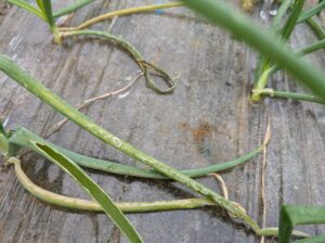新玉ねぎにチョウチョとんできて幼虫が葉を食べる
